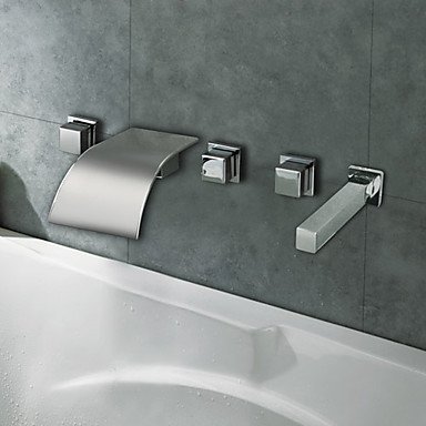 Specifications SpecificationFaucet TypeBathtub Faucet, FeaturesWaterfall, Installation TypeWall Mounted, Installation HolesFive Holes, Number Of HandlesThree Handles, FinishChrome, StyleContemporary, Flow Rate1.5 GPM (5.7 L/min) max, Cold and Hot SwitchYes, Valve TypeCeramic Valve, DimensionsSpout Width130mm (5.1"), Spout Length170mm (6.7"), MaterialFaucet Handle MaterialZinc Alloy, Handshower MaterialA Grade ABS Plastic, Faucet Body MaterialBrass, Faucet Spout MaterialStainless Steel, Accessories InformationValve IncludedYes, WeightNet Weight (kg)2.7, Shipping Weight (kg)3.2, Learn More About This Product Features:> Comes with all necessary accessories for installation.> Featured with durable ceramic valves ensuring there are no water leaks.> Available to work more than 600,000 times at a water temperature of 90 degrees.> High quality material and finishing tested at a high water pressure of 1.6Mpa. Read more details..