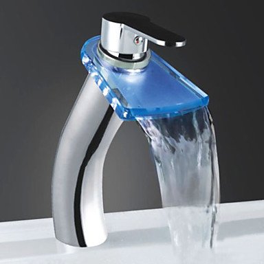 SpecificationsSpecificationFaucet Type Bathroom Sink Faucets,Feature Waterfall, LED,Installation Type Vessel,Installation Holes One Hole,Number of Handles Single Handle,Finish Chrome,Style Contemporary,Flow Rate 1.5 GPM (5.7 L/min) max,Valve Type Ceramic Valve,Battery Type AA,Cold and Hot Switch Yes,DimensionsOverall Height 290 mm ( 11.4 " ),Spout Height 185 mm ( 7.3 " ),Spout Length 130 mm ( 5.1 " ),Spout Width 96 mm ( 3.8 " ),Faucet center Single Hole,MaterialFaucet Body Material Brass,Faucet Spout Material Glass,Faucet Handle Material Brass,LED InformationLED Power Source Battery,LED Color Green, Red, Blue,LED turns Green between 30-40¡æ (86-104¨H),LED turns Blue between 0-30¡æ (32-86¨H),LED turns Red between 40-50¡æ (104-122¨H),LED begins flashing between 50-100¡æ (122-212¨H),Accessories InformationValve included Yes,Drain included No,Battery Included No,WeightsShipping Weight (kg) 1.08, Read more details..